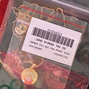 Brand-new in box, here is a Diamond Accent Pawprint Necklace in 18KT Gold Over Sterling (gold-plated sterling silver, aka, vermeil), by Ross-Simons. Description below comes directly from Ross-Simons website, so please visit their site for further specs/details on this necklace by simply typing "919989" into the search box. That number is visible on sticker under the barcode. Will come in pretty box & pouch as shown. Pendant is slightly smaller than a dime.
