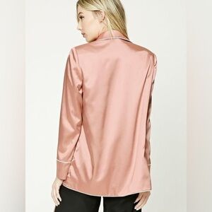 Perfect jacket to dress up any outfit!!! NWOT has been professionally dry cleaned. Forever 21 Satin Piped Blazer beautiful Rose gold color with white piping. Jacket has shoulder pads, front pockets and is lined.