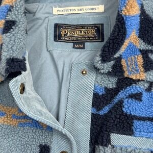 Wrap yourself in the iconic style of Pendleton with this cozy Berber fleece jacket. Its vibrant geometric Southwest pattern in shades of blue, tan, and black is a true statement piece. Lined with a smooth, light blue fabric, this jacket offers exceptional warmth and comfort. The durable corduroy accents on the collar, placket, and pocket add a touch of rustic charm. Two exterior welt pockets and one interior patch pocket. Perfect for a chilly autumn hike, a casual weekend outing, or layering for a stylish everyday look. Only noted flaw: Small tear in interior lining, as pictured last.