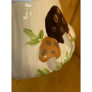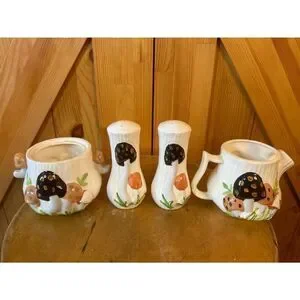 Vintage Arnels Mushroom Ceramic Creamer, Sugar Bowl, Salt and Pepper Shakers. No lid or stoppers. Wear on mushrooms on creamer and sugar bowl. Flaws on leaves and mushroom of salt and pepper shakers. See pictures. (5008) Measurements: Salt and Pepper Shakers Height 4.25" Sugar Bowl 2.75x 3" Creamer 3x4.75"