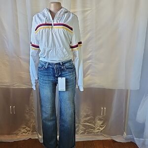 Stylish light blue flare jeans. Comfortable fit with a trendy design. Perfect for casual outings.