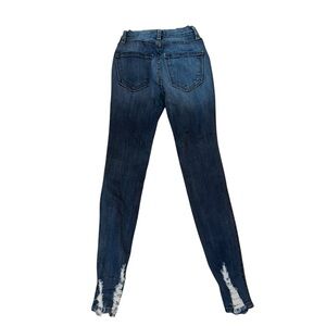 In excellent condition. Dark wash. Stretchy fit. Distressed. Chewed hem. 4 pockets. Buttoned zip fly closure. 25” waist x 9” rise x 28” inseam. Style # P1239. Size 3