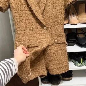 Chic tweed blazer with short sleeves skirt. Features a double-breasted front and flap pockets. Perfect for a polished look. Tweed like material. Heavy and well made.