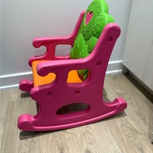 Delight your child with this vibrant pink and green rocking chair. Perfect for playtime and relaxation.