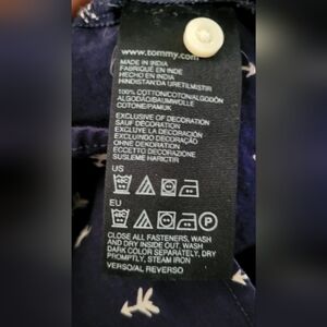Classic women’s Tommy Hilfiger button-down shirt in a navy blue color with a subtle white print. Timeless, versatile, and easy to style.