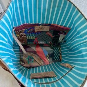 Features: The bag includes a detachable leather shoulder strap and an adjustable multi-colored woven crossbody strap, along with an Evie leather bag tag secured by a hand-woven "friendship" style bracelet. It features a zipper closure and interior pockets.