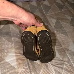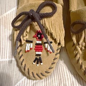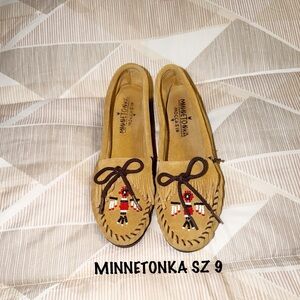 Chic Minnetonka moccasins in tan. Features vibrant embroidery. Ideal for everyday wear. They were worn one time. No flaws. They are like new. They are suede leather with a hard sole. Hand stitched by the Navajo. From a smoke and pet free home.