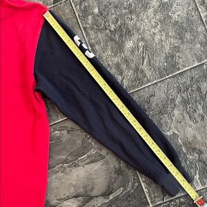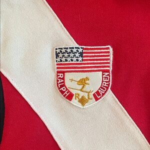 Vintage POLO RALPH LAUREN bold red and navy blue 2-button collar rugby polo design with iconic logo embroidered on chest and patch on opposite side. Features a diagonal white stripe. Ideal for casual wear.