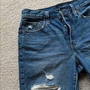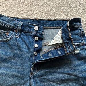 Levi's 501 jean shorts with a distressed look. Classic blue denim. Perfect for casual style. size 28, rise 10 ", inseam 5"