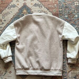 Rare colour-way. Elevate your casual style with this Gentle Fawn varsity jacket. Features a beige/mauve body with white faux leather sleeves. Stripped cuff and hem ribbing. Silky smooth lining. Two front pockets. Snap up. In perfect, like new condition.