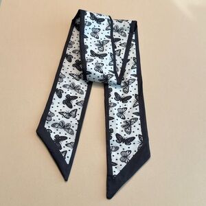 Add a touch of elegance to your outfit with this black and white butterfly scarf. Perfect for any occasion.