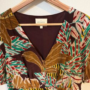 Chic Sezane silk maxi dress with leaf print. Features French buttons a V-neck and short sleeves. Ideal for stylish outings.