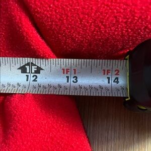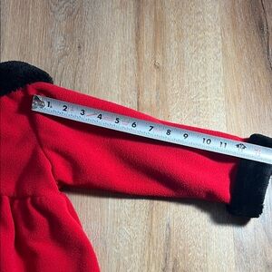 So soft. The jacket almost feels like fleece. It has buttons down the front. A hood and sleeves with black almost fur like. Adorable jacket to go over a holiday dress.