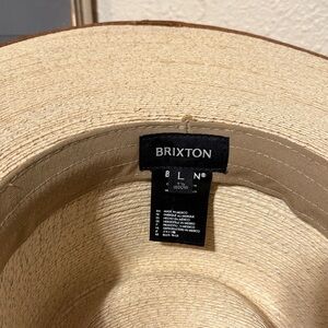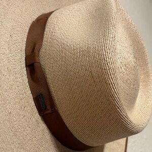 Stylish Brixton hat. Features a tan crown with a brown brim. Perfect for any occasion. Stetson style.