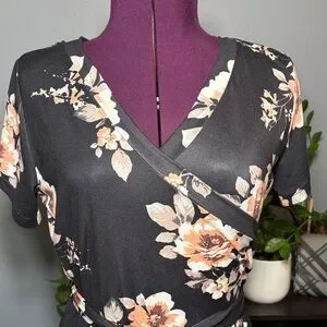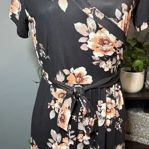 This chic black maxi dress features a stunning floral pattern, short sleeves and faux wrap look. Measurements are approximate and are taken laying flat.
