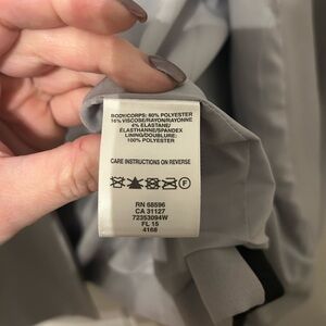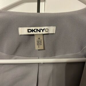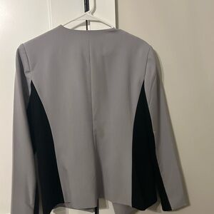 Elegant DKNYC blazer. Soft gray with bold black panels. Perfect for professional settings.