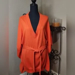 Stay stylish and cozy with this vibrant orange V-neck sweater. Perfect for any occasion, this sweater features a flattering belt to accentuate your waist. A must-have addition to your wardrobe. NWT. Size L/XL. Smoke-free, pet-free home