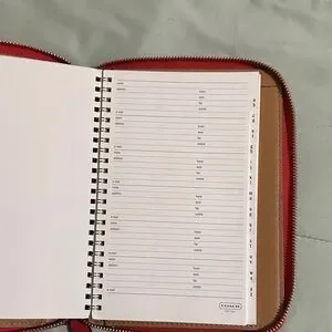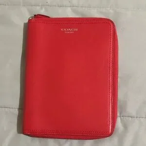 Elegant red address notebook by Coach. Features a secure zip-around closure.sorry it’s a coach pen but does not write ink is out..in used good condition