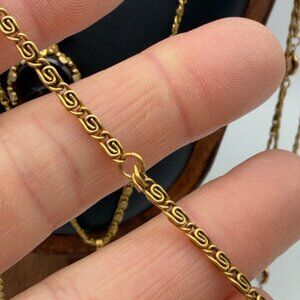 Vintage 1960s Goldette NY necklace featuring Greek meander designs with five layered chains and cameo pendants. Signed piece, reflecting timeless elegance and charm.