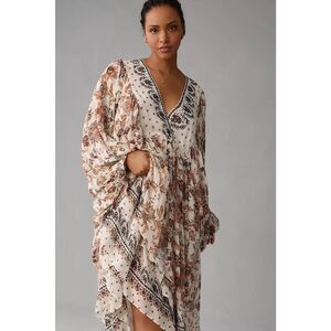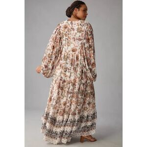 Embrace effortless boho charm in this stunning Anthropologie maxi dress, crafted from 100% lightweight viscose. Featuring voluminous peasant sleeves, a flattering v-neckline with contrast trim, and a tiered skirt that moves beautifully, it’s the perfect piece for brunch, vacation, or festival season. The dreamy floral print blends soft blush, rust, olive, and burgundy tones over a creamy base — romantic and earthy at once.