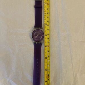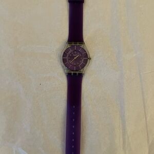 The Swatch Purple Classiness SFK365 watch is a stylish unisex wristwatch with a quartz movement. It features a silicone case in a vibrant purple color, complemented by a matching two-piece rubber strap. With a water resistance, this round watch with a 34mm case size exudes elegance and sophistication. Perfect for everyday wear, this Swatch watch comes without box or papers, making it a convenient and fashionable accessory for any occasion. New battery.
