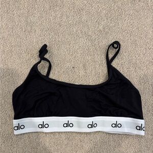 Chic black sports bra with strappy design. Features ALO logo. Perfect for workouts.