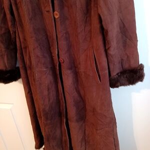Experience warmth and sophistication with this elegant brown leather jacket, Size XL featuring a luxurious fur trim. Fur detail is also in the lining of the coat. Perfect for elevating your style.
