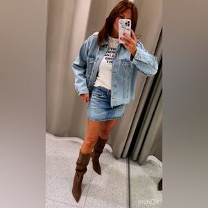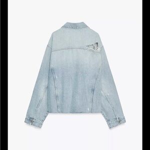 Stylish light blue denim jacket with ripped distressed details. Perfect for casual wear.