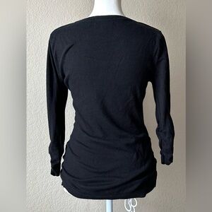 • Details: Scoop neck, 3/4 sleeves with subtle ruching, ribbed trim