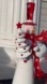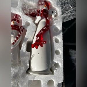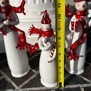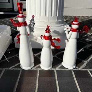 Each figure is decorated with red and white accessories like scarves and hats. The product is intended for holiday or Christmas home decor.