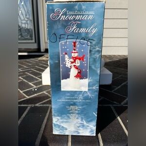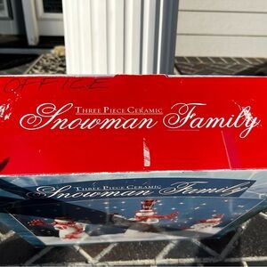 This is a set of three ceramic "Snowman Family" figurines. The set includes three individual snowman figures. They are made of ceramic material.