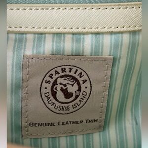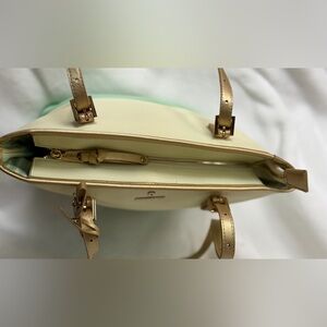 Stylish tote with gold accents. Mint bottom adds a fresh touch. Perfect for daily use. Does have a few spots on inside (see photos) could be cleaned, doesn’t appear to be set in. Also missing tassel but still has the hang tag, so you could put whatever purse charm you wanted on it!!!!