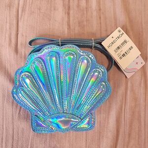 Vibrant shell-shaped bag. Holographic design. Fun accessory for kids.