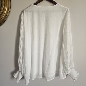 CHICSOUL.COM White Chiffon Crinkle Look Blouse w Full Bishop Sleeves. The blouse is loose fitting and lightweight. The bodice and torso are fully lined, the sleeves are semi-sheer. The shirt is in excellent condition, with one small snag at the shoulder (shown in last photo). Smoke/Pet Free Home.