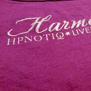 This NWOT Purple Harmonie HPNOTIQ Liqueur LiveLouder Sexy Tee w/Double Sided Graphics was a promotional item I received at work and never wore. Tag says Large but I would say it's more of a Small size. Rich purple color with silver foil graphics....see pics for visual info. please. Has cap sleeves. 100% Cotton, soft and stretchy material. Non-smoking home.