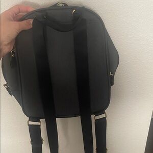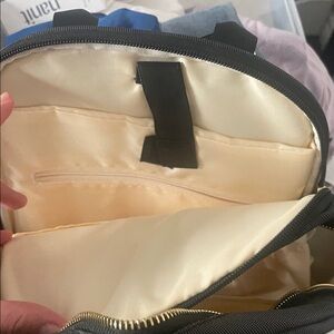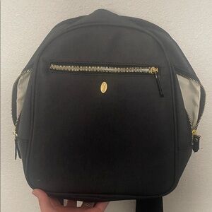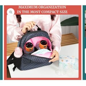 This elegant black backpack features stylish gold details, perfect for moms on the go. Slots for hands free pumps, elvie, willow, momcozy, etc.