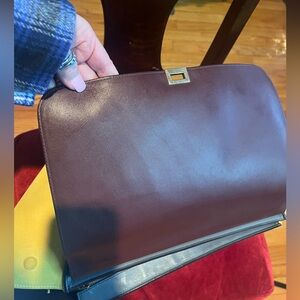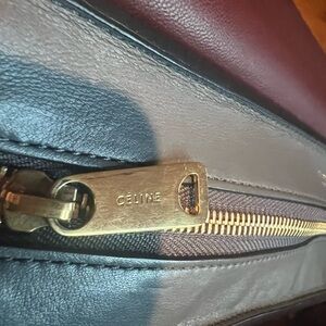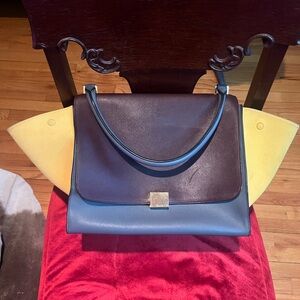 Couple small stains on side suede. Not seen when sides tucked inside bag. Very minor scratches on leather and hardware.