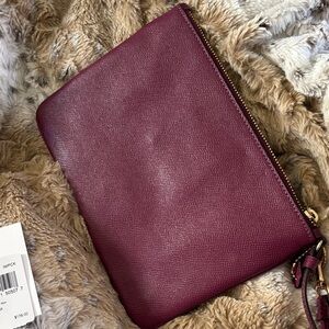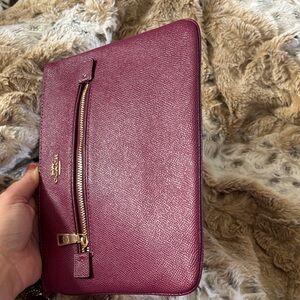 Chic Coach wristlet in dark berry. Features gold hardware. Includes wrist strap for easy carrying. Strap can attach to side o-ring or clip on zipper.
