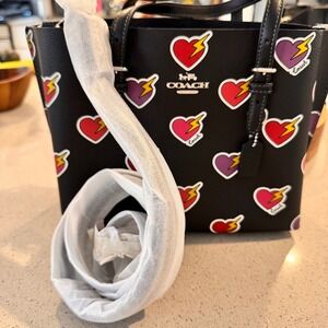 Keywords: Coach handbag, heart print, lightning bolt, designer tote, leather bag, top handle bag, charm detail, quirky fashion, everyday bag, weekend bag, gift for her, pop of color