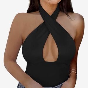 Chic black one-piece with halter neckline. Stylish and sophisticated. REORIA Women's Sexy Criss Cross Halter Neck Sleeveless Thong Bodysuits Tops Clubwear.