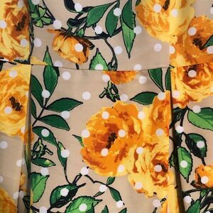 New York & Company women’s yellow rose floral polka dot dress with pockets. Size 14. Fully lined. Round neck. Sleeveless. Hidden back zipper. A line. Bottom half of dress is pleated. Like new condition. Great dress for date night or parties