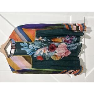 A vibrant long sleeve blouse featuring a unique combination of floral and striped patterns. The front showcases a dark green base with large floral prints, while the sleeves and back display multicolored stripes in shades of purple, blue, orange, and green. The blouse has a round neckline and gathered cuffs with ruffle details, adding a touch of elegance. Made from lightweight, semi-sheer fabric, perfect for layering or wearing alone and buttons in the back.