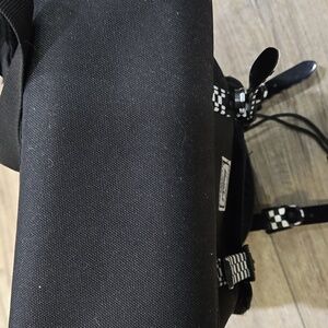 Stylish black backpack featuring distinctive checkered straps. Perfect for everyday use.