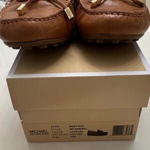 Chic tan leather loafers with bow detail. Perfect for casual elegance.