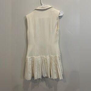 Sleeveless suit jacket-style short dress featuring a V-neck lapel suit collar, a button fastening, flap pockets and a pleated skirt. Runs big, size down.