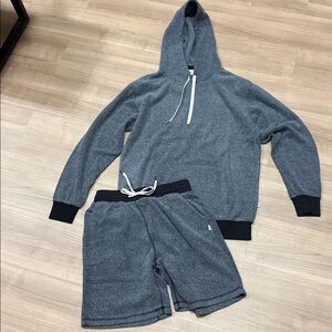 Cozy gray hoodie and shorts set with black accents. Perfect for lounging.