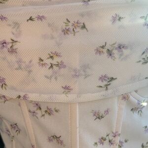 Chic camisole with floral design. Features delicate purple accents. Ideal for stylish outings. Straps can be tightened or loosened. There is some frying on the lower back. Does not affect the integrity of the shirt. Bundle with other items for a discount.