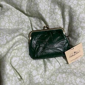 Patricia Nash green leather coin purse with key ring, featuring a beautiful embossed design. Brand new with tags! So pretty.