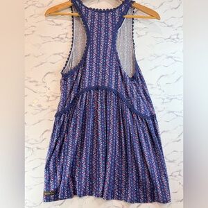 Bohemian style flowy top with vibrant floral print. Features a delicate lace neckline. NWT size small, designed oversized