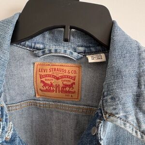 Ladies, Levi’s, large light wash denim jean jacket. Layer this one! Length 21 in